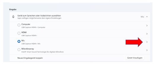 wählen Sie den Reiter Eingabe und dann das Gerät: USB Capture HDMI+ Mic